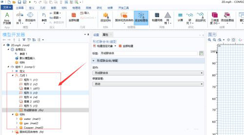 4、第四步:進入最終模型導航,建立所研究問題的幾何結構以及所需要的材料屬性,如圖所示。材料屬性可以自己定義,也可以通過comsol內置材料庫調取使用。