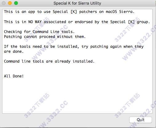 2、然后我們打開“Special K for Sierra Utility”程序(如果提示需要安裝“Xcode”命令行工具,請安裝,否則無法破解),如kkx分享的截截圖: