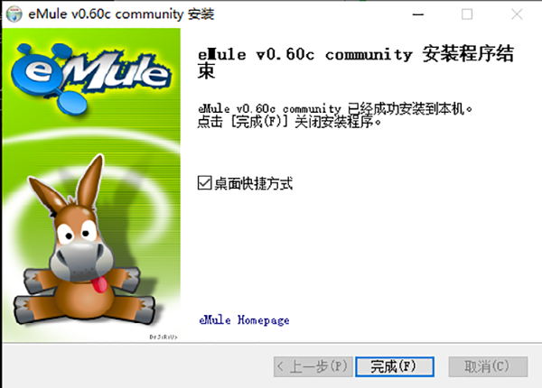 10、“eMule0.60c community”安裝程序結(jié)束,點擊完成,可以開始使用了。