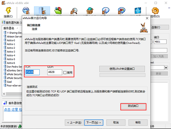 4、設(shè)置端口和連接,可以自定義也可以默認,然后點擊測試端口即可,點擊下一頁;