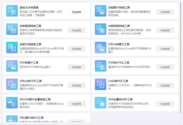 包括全能pdf轉(zhuǎn)換器(轉(zhuǎn)圖片轉(zhuǎn)WORD,轉(zhuǎn)HTML), Office轉(zhuǎn)換器WORD、PPT\ EXCEL轉(zhuǎn)圖片及PDF)全能圖片轉(zhuǎn)換工具( dicom格式轉(zhuǎn)png)全能音頻轉(zhuǎn)換工具(文本轉(zhuǎn)語(yǔ)音),全能視頻轉(zhuǎn)換工具,全部支持批量轉(zhuǎn)換。