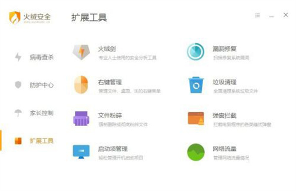 擴(kuò)展工具為您提供了火絨劍、修改HOST文件、右鍵管理、垃圾清理、文件粉碎、彈窗攔截、啟動(dòng)項(xiàng)管理、網(wǎng)絡(luò)流量八大擴(kuò)展工具,實(shí)用、方便,擴(kuò)展工具不是默認(rèn)捆綁安裝,未加載前不占電腦內(nèi)存,只有在您需要并親自點(diǎn)擊時(shí),才會(huì)下載安裝。