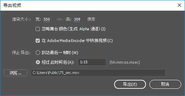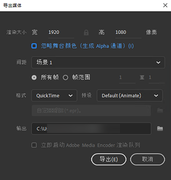 ③在 Adobe Media Encoder 中轉(zhuǎn)換視頻:如果您希望使用 AME 將導(dǎo)出的 MOV 文件轉(zhuǎn)換為一種不同的格式,請(qǐng)選擇此選項(xiàng)。如果選中,則在 Animate 完成視頻導(dǎo)出后,AME 將啟動(dòng)。