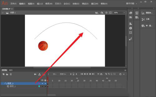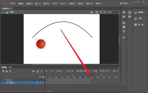 8、把籃球?qū)拥牡谝粋€(gè)關(guān)鍵幀上的籃球元件移動(dòng)到曲線(xiàn)頭部。同樣把第40幀處的關(guān)鍵幀上的籃球元件移動(dòng)到曲線(xiàn)末尾。