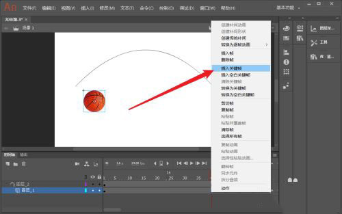 9、選擇籃球第1個(gè)關(guān)鍵幀,然后點(diǎn)右鍵選擇創(chuàng)建傳統(tǒng)補(bǔ)間動(dòng)畫(huà)。這樣一個(gè)籃球沿曲線(xiàn)軌跡運(yùn)動(dòng)的動(dòng)畫(huà)就制作完成了。