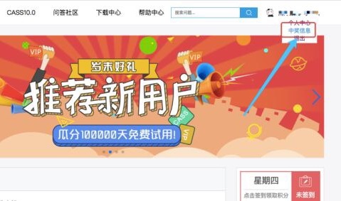 2、登錄成功后,在頁面右上角點擊您的個人頭像的小三角形進入“中獎信息”頁面,如kkx分享的截圖:(注:如果是通過CASS10試用申請獲得的試用劵點擊“個人中心”)