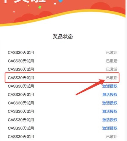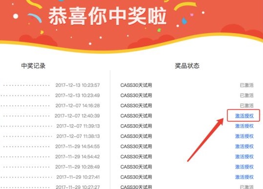 3、在中獎信息頁面找到相應需要激活的CASS試用劵,點擊藍字“激活授權(quán)“,如kkx分享的截圖: