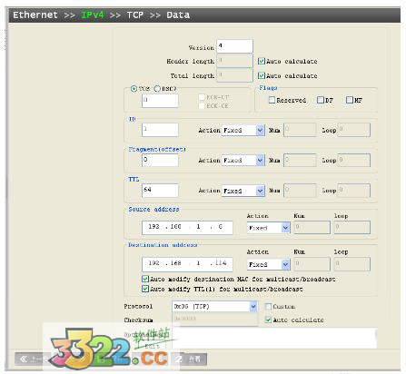 構造報文應用指導的形式,先后構造每一層協(xié)議的頭部;構造完一層協(xié)議的頭部后,從界面中選擇相應的下一頭部種類,點擊下一步,就可以形成相對應的協(xié)議,如以太網接口中挑選0x0800,則點一下下一步按鍵后,建立IP頭部構造界面。