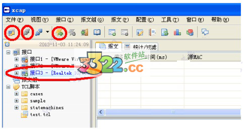 點擊工具欄中的“啟動接口”按鈕,接口啟動。點擊工具欄中的“開始抓包按鈕”,應用程序進入網絡監(jiān)聽狀態(tài)。