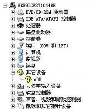 3、可以看到“adb interface”這里的顯示嘆號(hào)的,說(shuō)明adb驅(qū)動(dòng)沒有安裝;