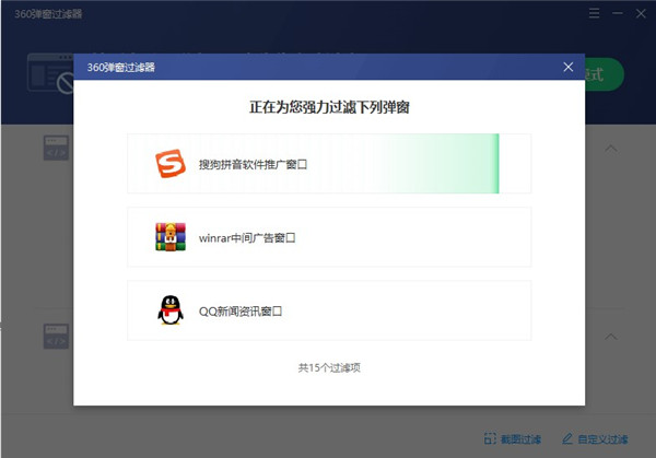 5、打開彈窗過(guò)濾器窗口,其中列出了能攔截彈窗的軟件軟件列表,點(diǎn)擊勾選要攔截彈窗的軟件。