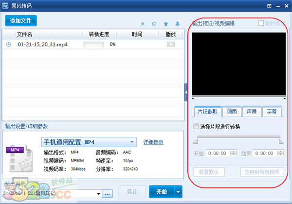 4、除此之外還可以使用暴風(fēng)轉(zhuǎn)碼實(shí)時(shí)預(yù)覽、添加字幕、放大聲音、切畫面和截取片段。