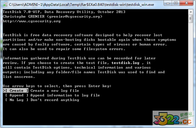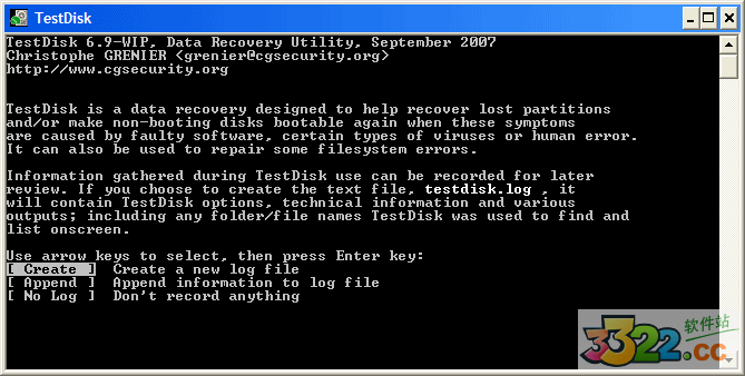 選擇 Create 來(lái)讓 Testdisk 新建一個(gè)日志文件( log file) ,里邊包含了一些技術(shù)信息和消息, 除非你要往一個(gè)日志里追加信息 log 或者 你從只讀存儲(chǔ)器里執(zhí)行 TestDisk 而且必須在別的地方建立日志 log。