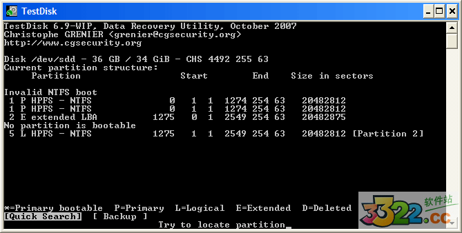 在 Quick Search(快速搜索)的過(guò)程中, TestDisk 找到了兩個(gè)分區(qū),包括那個(gè)不見(jiàn)的邏輯分區(qū),如kkx分享的截圖: