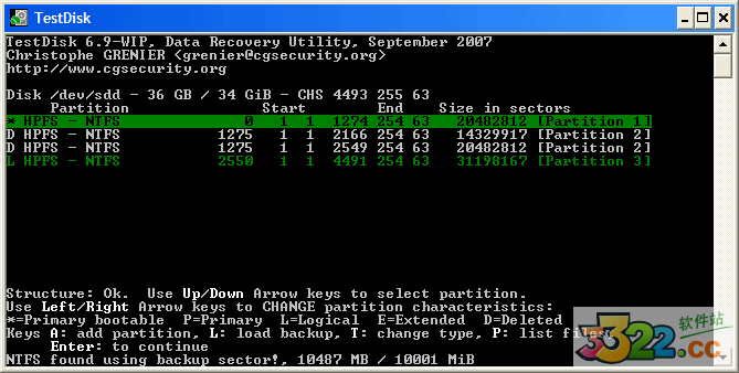 第一個(gè)分區(qū) "Partition 1" 被用 backup boot扇區(qū) 找到了。 屏幕上的最后一欄寫(xiě)著, "NTFS found using backup sector!" 還有分區(qū)尺寸。 分區(qū)2 "partition 2" 被顯示了兩次,而且大小不同。
