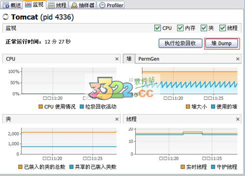 在監(jiān)視標簽內,我們可以看到實時的應用程序內存堆以及永久保留區(qū)域的使用情況。