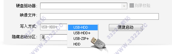 4、選擇后彈出如下窗口,依次按圖示選擇:USB-HDD+ v2、高端隱藏 、U盤(pán)(插入多個(gè)U盤(pán)時(shí)需選擇)