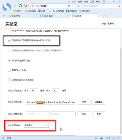 6、選中“在兼容模式下使用高級(jí)渲染特性和GPU加速”,并將內(nèi)核選擇策略請(qǐng)選擇為“兼容模式”。