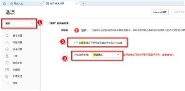 7、如果在“高級(jí)”選項(xiàng)下找不到“兼容模式”,可以在設(shè)置界面搜索框中輸入“兼容”(圖示位置1),然后按下Enter鍵,接著就會(huì)在界面上看到“在兼容模式下使用高級(jí)渲染特性和GPU加速”和“內(nèi)核選擇策略”選項(xiàng)啦。