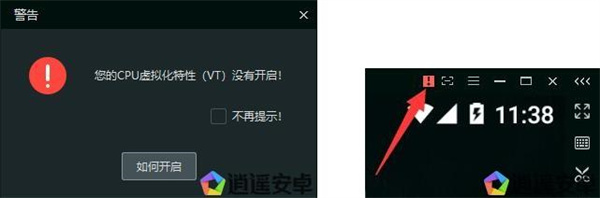 如果你的模擬器運行時出現(xiàn)以下彈窗,或者模擬器窗口右上方出現(xiàn)感嘆號一樣的警告標(biāo)志,說明VT功能未正常工作。