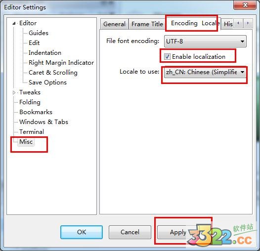 4、選擇【Misc->Encoding Locale】,修改Locale to use的值為zh_CN:Chinese(Simplified),然后點【Apply】。