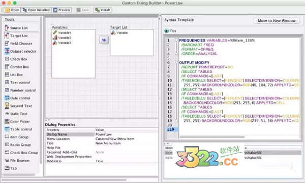 ▲您可以指定將定制對話框安裝到安裝對話框時創(chuàng)建的新子菜單。您還可指定是將定制對話框安裝到所有窗口類型(“數(shù)據(jù)編輯器”、“語法”和“查看器”)還是僅安裝到特定窗口類型