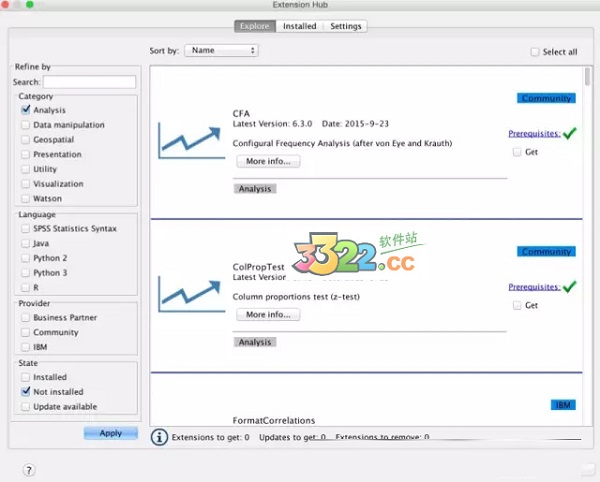 這些擴展內(nèi)容是通過SPSS Statistics語法、Java、R、Python 2或Python 3開發(fā)好的組件,可直接下載使用,目前已經(jīng)有近百個應用程序可供下載