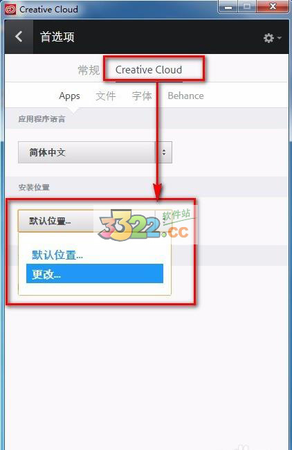 2、如果用戶(hù)想要更改安裝路徑,需要提前安裝Creative Cloud,來(lái)更改默認(rèn)安裝路徑,如下圖所示: