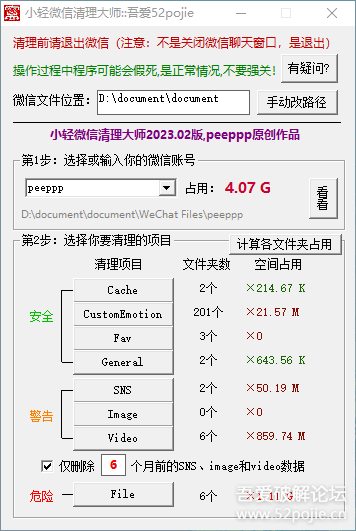 新版本增加了很多網(wǎng)友強烈推薦的可以定制保留月份的功能,并且每個文件夾都增加了計算子文件夾數(shù)量的功能,提示信息更多,修復(fù)了一個在某些系統(tǒng)中無法自動識別到微信文件夾的bug(也不算bug吧,微軟系統(tǒng)自己更改了注冊表中我的文檔的注冊表鍵值名稱,所以多加了一個判斷),如果自動識別不到,那就手工改一下。