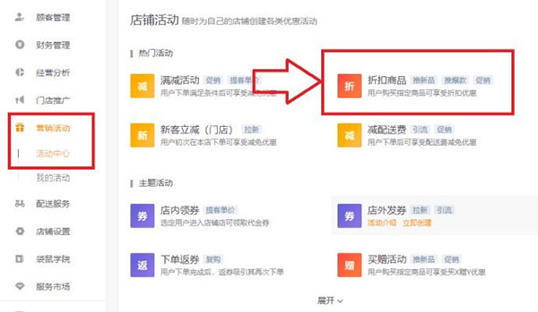 1、打開美團(tuán)外賣商家版電腦版軟件,打開軟件后點(diǎn)擊點(diǎn)擊左側(cè)的【營銷活動】點(diǎn)擊【活動中心】,在右側(cè)界面中點(diǎn)擊【折扣商品】選項,如kkx分享的截圖: