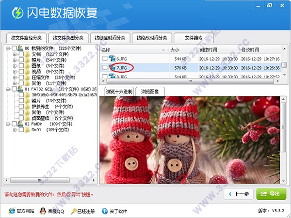 5)掃描完成后,進(jìn)入文件導(dǎo)出對(duì)話框。點(diǎn)開(kāi)左邊樹(shù)形控件,找到您刪除文件的目錄,點(diǎn)擊找到的目錄,右邊列表框列出目錄下所有可以恢復(fù)的文件的文件名。如果列表框里是圖片文件,鼠標(biāo)點(diǎn)擊后,下面可以預(yù)覽圖片內(nèi)容。如果不能預(yù)覽圖片內(nèi)容,則圖片的數(shù)據(jù)已經(jīng)被破壞。如果您的文件是病毒破壞、殺毒軟件誤刪除,也在對(duì)應(yīng)的目錄下找您的文件。如下圖所示,我們刪除了分區(qū)根目錄下的“桌面”目錄里的7.jpg文件。現(xiàn)在已經(jīng)找到刪除的文件,并且可以完美恢復(fù)。