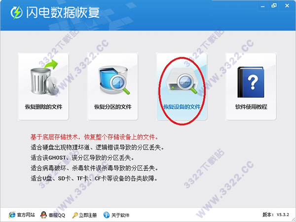 1)進(jìn)入主功能界面,點(diǎn)擊主界面上的"恢復(fù)設(shè)備的文件功能按鈕,如kkx分享的截圖: