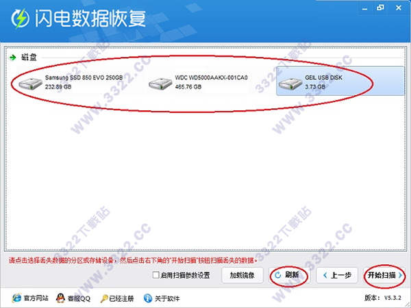 2)進(jìn)入磁盤選擇界面,如果您要恢復(fù)的是移動(dòng)硬盤、U盤、內(nèi)存卡等移動(dòng)存儲(chǔ)設(shè)備,且設(shè)備列表里沒(méi)有您需要恢復(fù)的存儲(chǔ)設(shè)備,請(qǐng)重新拔插您的移動(dòng)存儲(chǔ)設(shè)備,然后點(diǎn)擊“刷新”按鈕,鼠標(biāo)左鍵點(diǎn)擊您要恢復(fù)文件的存儲(chǔ)設(shè)備,然后點(diǎn)擊開(kāi)始掃描按鈕。,如kkx分享的截圖: