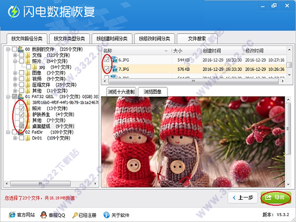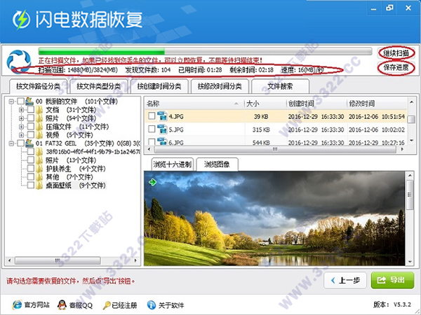 4)掃描完成后,進(jìn)入文件導(dǎo)出對(duì)話框,點(diǎn)開(kāi)左邊樹(shù)形控件,在對(duì)應(yīng)的目錄下找您丟失的文件,右邊列表框列出目錄下所有可以恢復(fù)的文件的文件名。如果列表框里是圖片文件,鼠標(biāo)點(diǎn)擊后,下面可以預(yù)覽圖片內(nèi)容。如果不能預(yù)覽圖片內(nèi)容,則圖片的數(shù)據(jù)已經(jīng)被破壞。