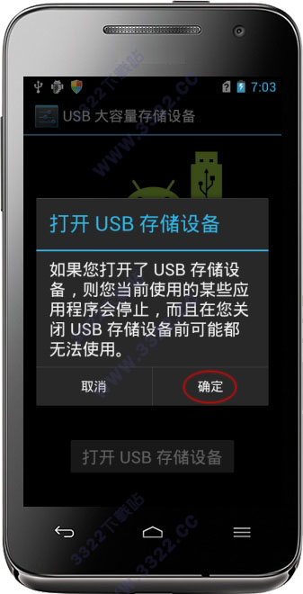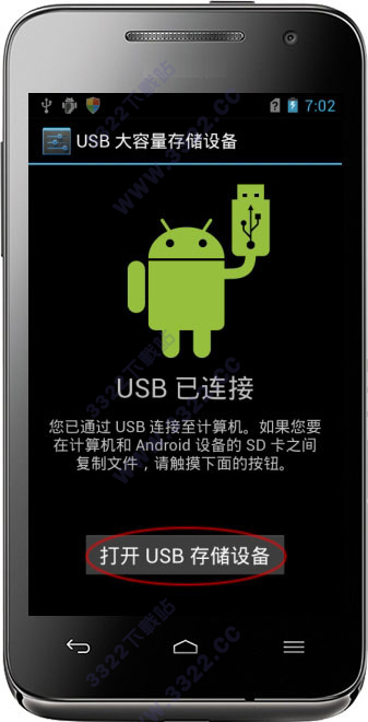 3)進(jìn)入U(xiǎn)SB已連接界面,點(diǎn)下面“打開(kāi)USB存儲(chǔ)設(shè)備”按鈕,如kkx分享的截圖: