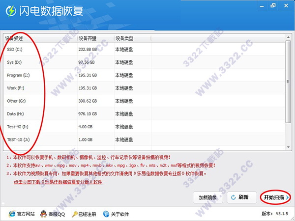 2)運(yùn)行閃電恢復(fù)軟件,出現(xiàn)下面界面,軟件會(huì)讀取您的所有分區(qū),鼠標(biāo)左鍵點(diǎn)擊您需要恢復(fù)的分區(qū),接著點(diǎn)右下角的開(kāi)始掃描,如kkx分享的截圖: