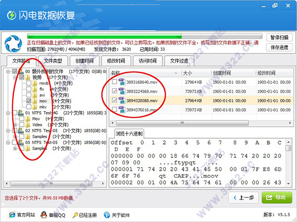 4)掃描結(jié)束,下圖是分析的結(jié)果,勾選需要的視頻文件,點(diǎn)右下的導(dǎo)出按鈕即可導(dǎo)出選中的文件,如kkx分享的截圖:
