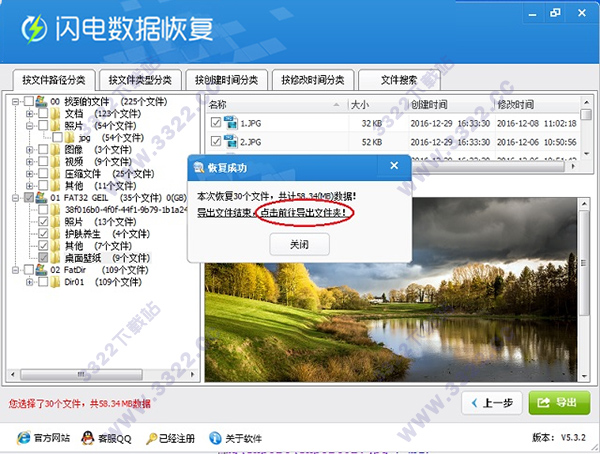 4)彈出恢復(fù)成功的提示信息。 您可以點(diǎn)擊鏈接直接進(jìn)入導(dǎo)出數(shù)據(jù)目錄。