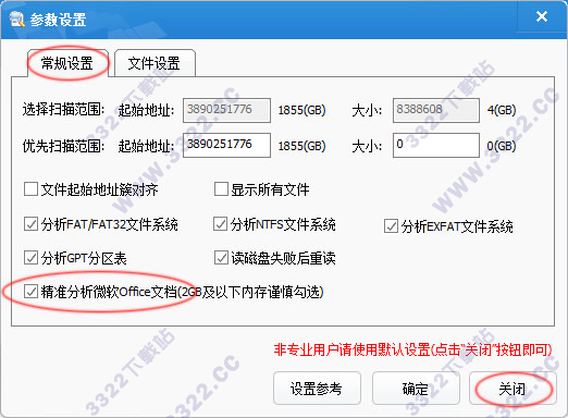 3)優(yōu)先掃描范圍: 指定選擇掃描范圍內(nèi)優(yōu)先掃描的范圍,文件起始地址簇對(duì)齊: 恢復(fù)刪除的文件時(shí),建議勾選此項(xiàng),其他情況建議不勾選,顯示所有文件: 恢復(fù)刪除的文件時(shí),此項(xiàng)為不可操作,其他情況默認(rèn)不勾選?;謴?fù)分區(qū)的文件、恢復(fù)磁盤的文件可以勾選此項(xiàng),勾選此項(xiàng)后分析結(jié)果會(huì)顯示刪除的文件,分析FAT/FAT32文件系統(tǒng): 默認(rèn)為選中,如果您確定您的設(shè)備不是使用FAT/FAT32文件系統(tǒng),可以取消此項(xiàng)勾選,分析NTFS文件系統(tǒng): 默認(rèn)為選中,如果您確定您的設(shè)備不是使用NTFS文件系統(tǒng),可以取消此項(xiàng)勾選,分析EXFAT文件系統(tǒng): 默認(rèn)為選中,如果您確定您的設(shè)備不是使用EXFAT文件系統(tǒng),可以取消此項(xiàng)勾選,分析GPT分區(qū)表: 默認(rèn)為選中,如果您確定您的設(shè)備不是使用GPT方式分區(qū),可以取消此項(xiàng)勾選,讀磁盤失敗后重讀: 默認(rèn)為選中。如果您要恢復(fù)的存儲(chǔ)設(shè)備上有非常嚴(yán)重的壞道,建議取消此項(xiàng)勾選以加快掃描、恢復(fù)速度,精準(zhǔn)分析微軟Office文檔: 掃描磁盤的時(shí),分析所有找到的Office文檔的數(shù)據(jù),極大的提高Office文檔分析的精度,強(qiáng)烈推薦勾選。此項(xiàng)功能需要更多的內(nèi)存和CPU資源,勾選后掃描速度會(huì)略慢。1GB及以下內(nèi)存的電腦此項(xiàng)不可勾選,小于2GB內(nèi)存的電腦此項(xiàng)默認(rèn)未勾選,用戶可以勾選此項(xiàng)。