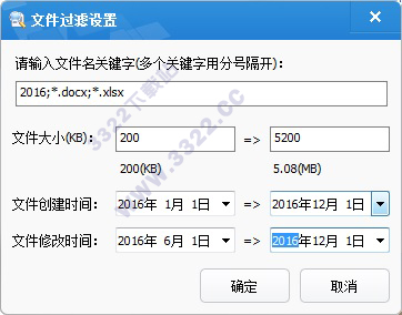 2)請(qǐng)輸入文件名關(guān)鍵字,多個(gè)關(guān)鍵字用";"隔開(kāi)。比如,我設(shè)置的就是找到所有文件名字包含2016的docx、xlsx文件。