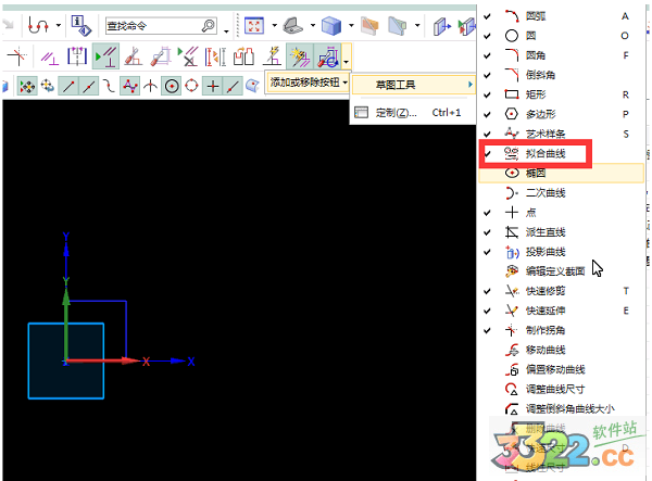 9、為便于使用擬合樣條,可以把其命令啟動圖標(biāo)放置到草繪常用工具中,如下圖: