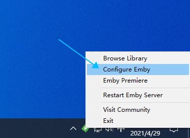 2、右鍵任務欄上出現(xiàn)的綠色小圖標,選擇Configure Emby。若出現(xiàn)“Emby Server is loading.”,則等一小會,再刷新該頁面。