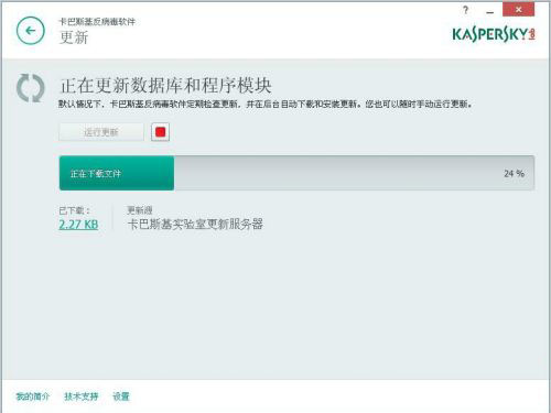 3、點(diǎn)擊更新功能,這里是每天卡巴斯基要更新病毒數(shù)據(jù)庫(kù)的地方,第一次安裝卡巴斯基的時(shí)候可能機(jī)器會(huì)很卡,因?yàn)樗诟聰?shù)據(jù)庫(kù),等大約10-20分鐘就完成了。