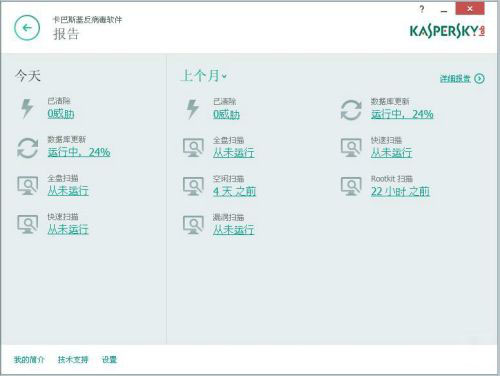 4、點(diǎn)擊報(bào)告功能,這里卡巴斯基給用戶看的數(shù)據(jù)報(bào)告,以及卡巴斯基殺毒的成果所在地。