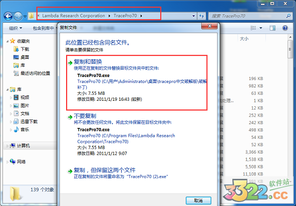 2、將復(fù)制的文件復(fù)制到軟件的安裝目錄(默認(rèn)路徑是"C:\Program Files\Lambda Research Corporation\TracePro70")覆蓋掉原文件即可