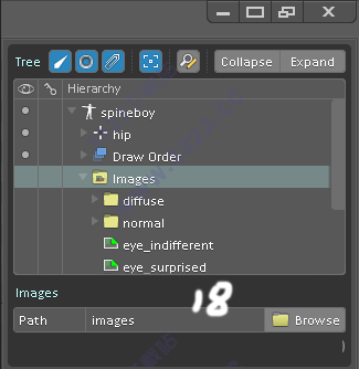 d)圖片路徑:這里顯示硬盤上的圖片資源。Spine只是從路徑引用圖片,并沒有把文件導(dǎo)進(jìn)項(xiàng)目。只是原封不動(dòng)的顯示硬盤上文件夾的內(nèi)容。