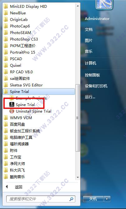 點(diǎn)擊開始菜單-所有程序-Spine Trial,點(diǎn)擊“Spine Trial.exe”即可啟動(dòng)程序