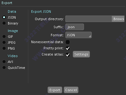 Spine 能將項(xiàng)目中的動(dòng)畫導(dǎo)出為 JSON 或二進(jìn)制格式文件,它們能在 Spine 運(yùn)行時(shí)庫中完美的再現(xiàn)。 Spine 同時(shí)還可以導(dǎo)出 GIF 動(dòng)畫, PNG 或 JPG 序列圖,還有 AVI或 QuickTime 的視頻文件。