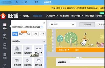 5、選擇【模塊】可以自定義設(shè)置模塊的大小和寬度,1920代表屏幕寬,950代表頁面中間的大模塊,和頁頭的logo寬度一致,190代表左側(cè)的【客服中心】寬度,750代表右側(cè)的【寶貝推薦】寬度