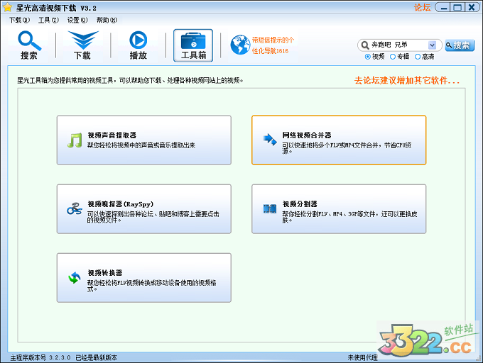 星光高清視頻下載軟件是一個(gè)集視頻搜索、視頻下載、視頻播放、視頻轉(zhuǎn)換、視頻合并等功能于一體的多功能軟件。星光高清視頻下載軟件可以搜索優(yōu)酷、土豆、酷5網(wǎng)等現(xiàn)今主流的視頻播放網(wǎng)站中的所有視頻資源并提供下載。同時(shí)用戶如果不想下載也可以直接在此進(jìn)行視頻的觀看,星光高清視頻下載軟件自帶播放器無需下載即可在線觀看哦。更多功能,用戶自行下載體驗(yàn)吧。